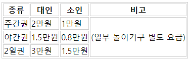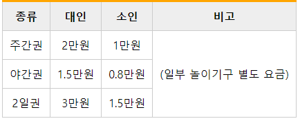 <td>주간권</td> <td>2만원</td> <td>1만원</td> <td>(일부 놀이기구 별도 요금)</td>
