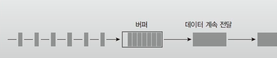 일정한 크기가 되면 한 번에 데이터를 처리하며, 버퍼링은 버퍼에 데이터가 찰 때까지 모으는 작업을 말한다.