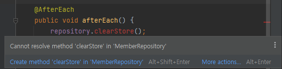 이제 테스트 코드에 @AfterEach를 사용하여 메모리DB를 비워주는 작업을 하는 메소드를 작성한다.