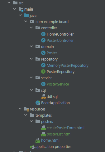 - 서비스: 핵심 비즈니스 로직 구현. 게시글을 작성하고 찾는 기능을 제공. (리포지토리를 이용해)