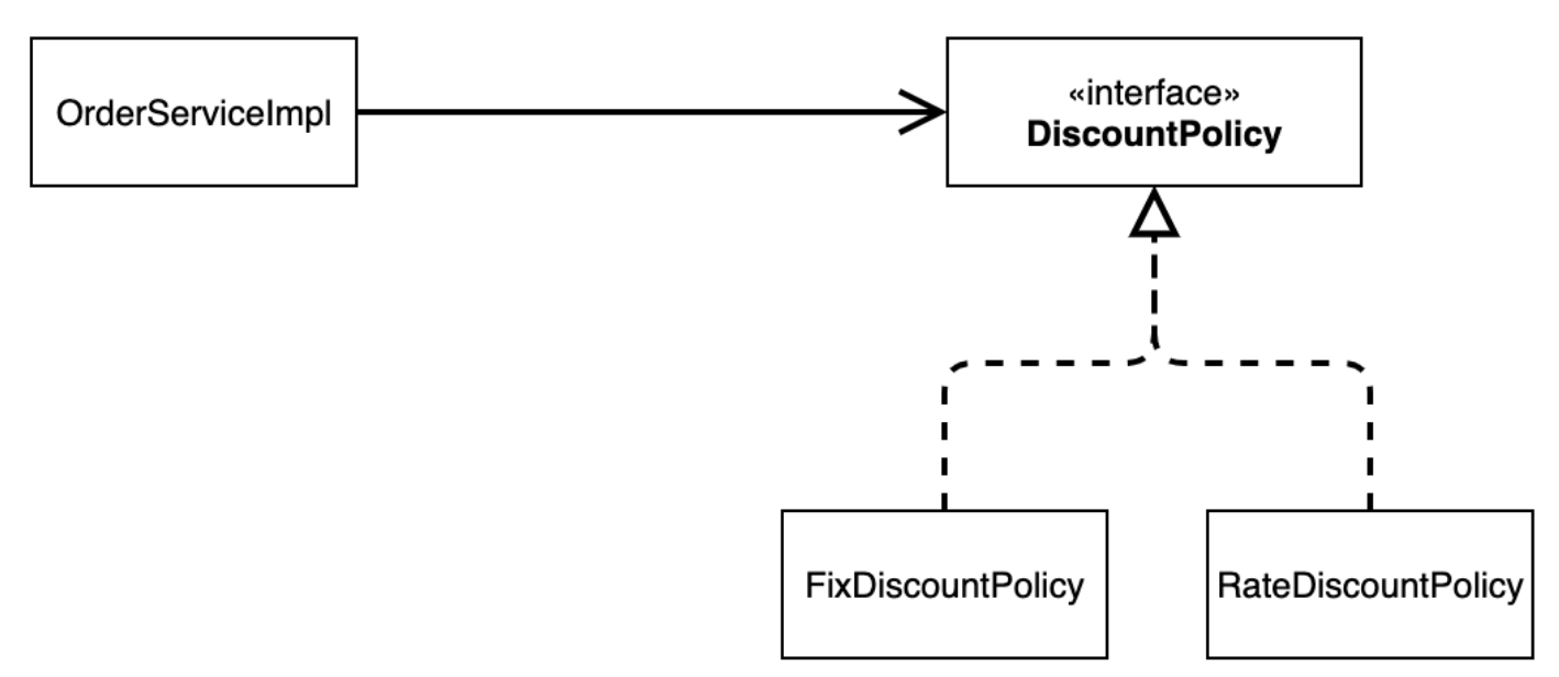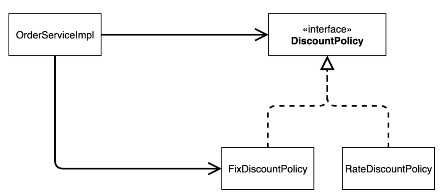 그래서 정책을 Fix, Rate로 구체 클래스를 변경할때 OrderServiceImpl도 코드 변경을 해야 한다.