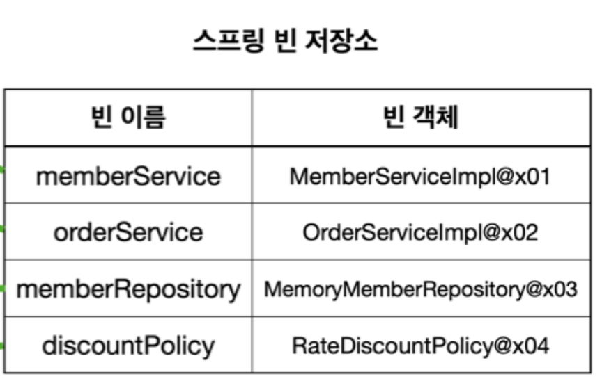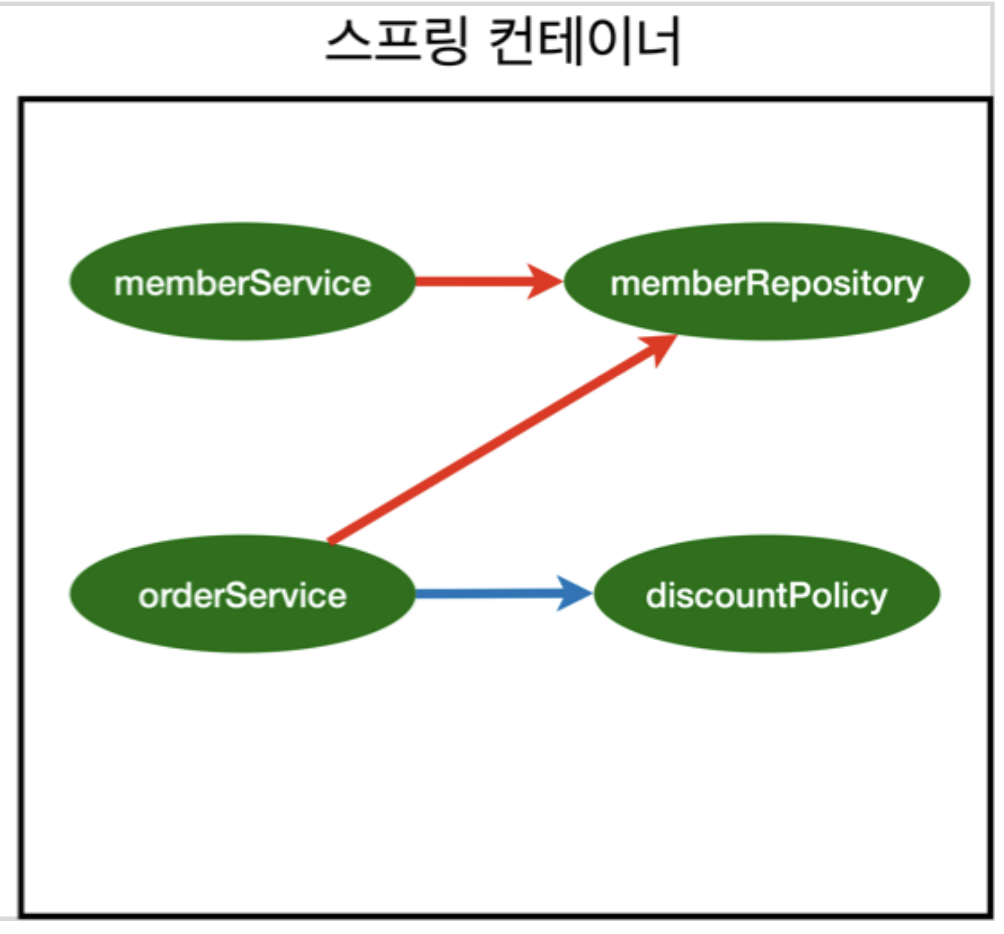 스프링 컨테이너는 구성(설정) 정보로 스프링 빈을 등록하고, 의존관계를 주입한다. 아래의 상태를 이룬다.