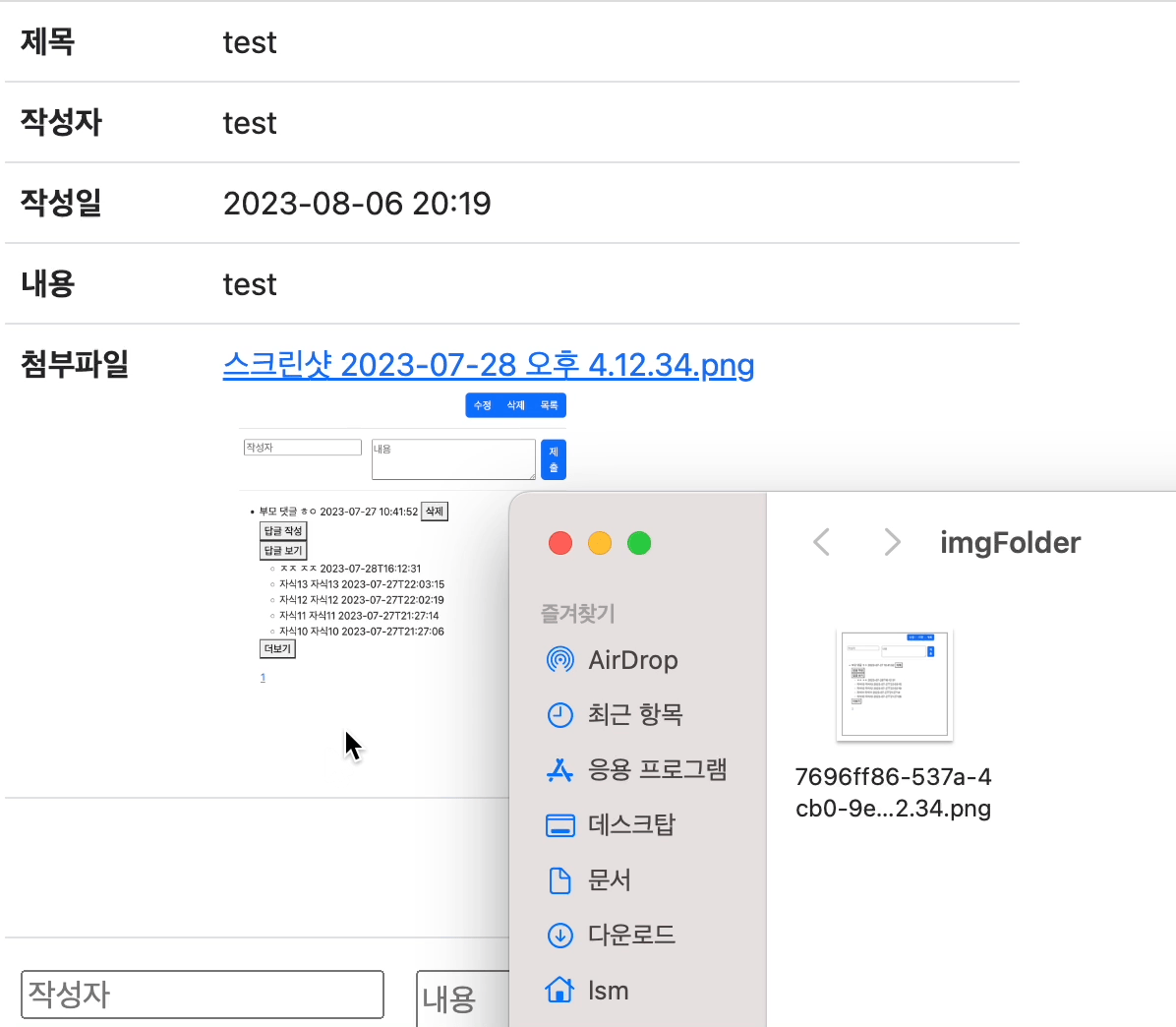 게시글 삭제시 해당 게시글에 포함되어 서버 내부에 저장된 파일 또한 같이 삭제하는 기능이다.