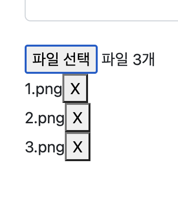 파일들을 추가할때 태그를 생성하여 'file-list' 아래에 파일에 관한 정보와 삭제 버튼을 자식으로 보냈다.