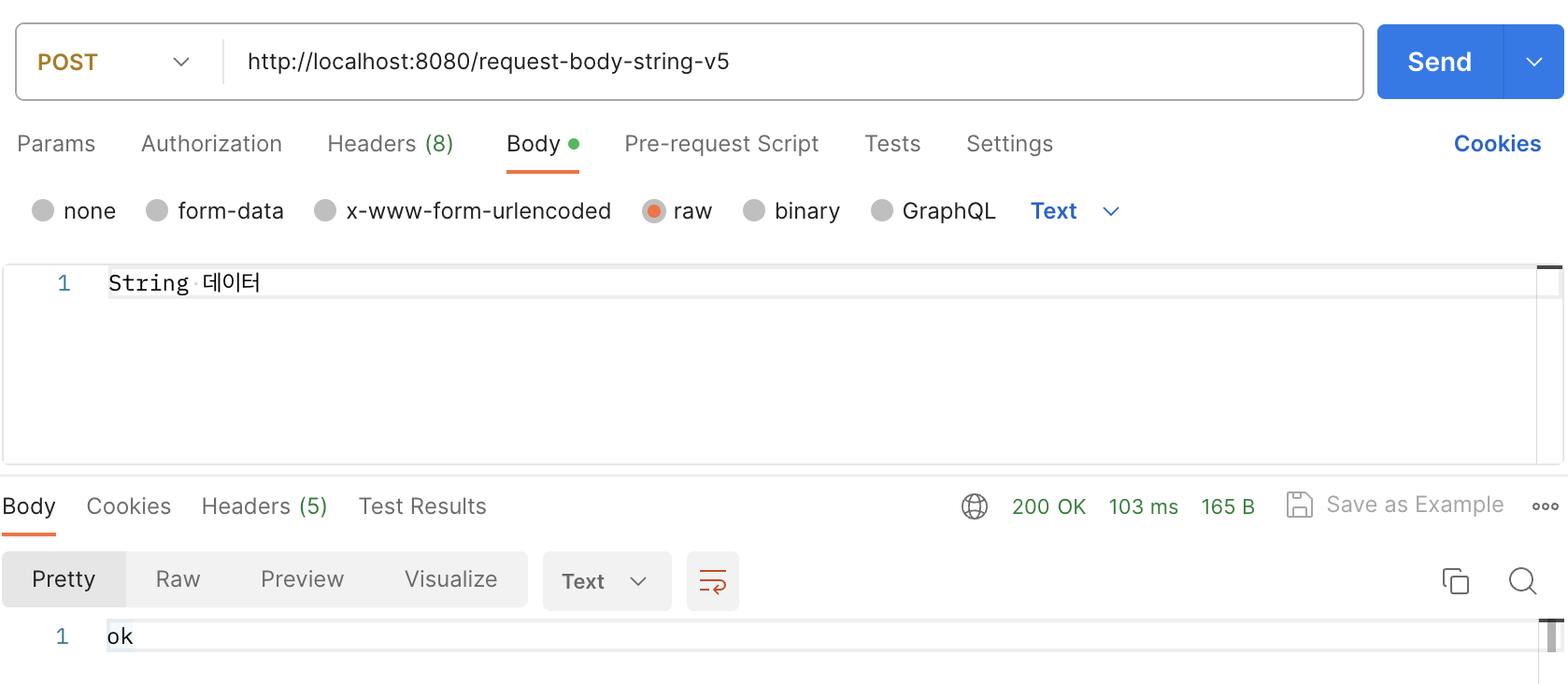 응답으로 문자열 "ok"가 그대로 바디에 담겨 온다.