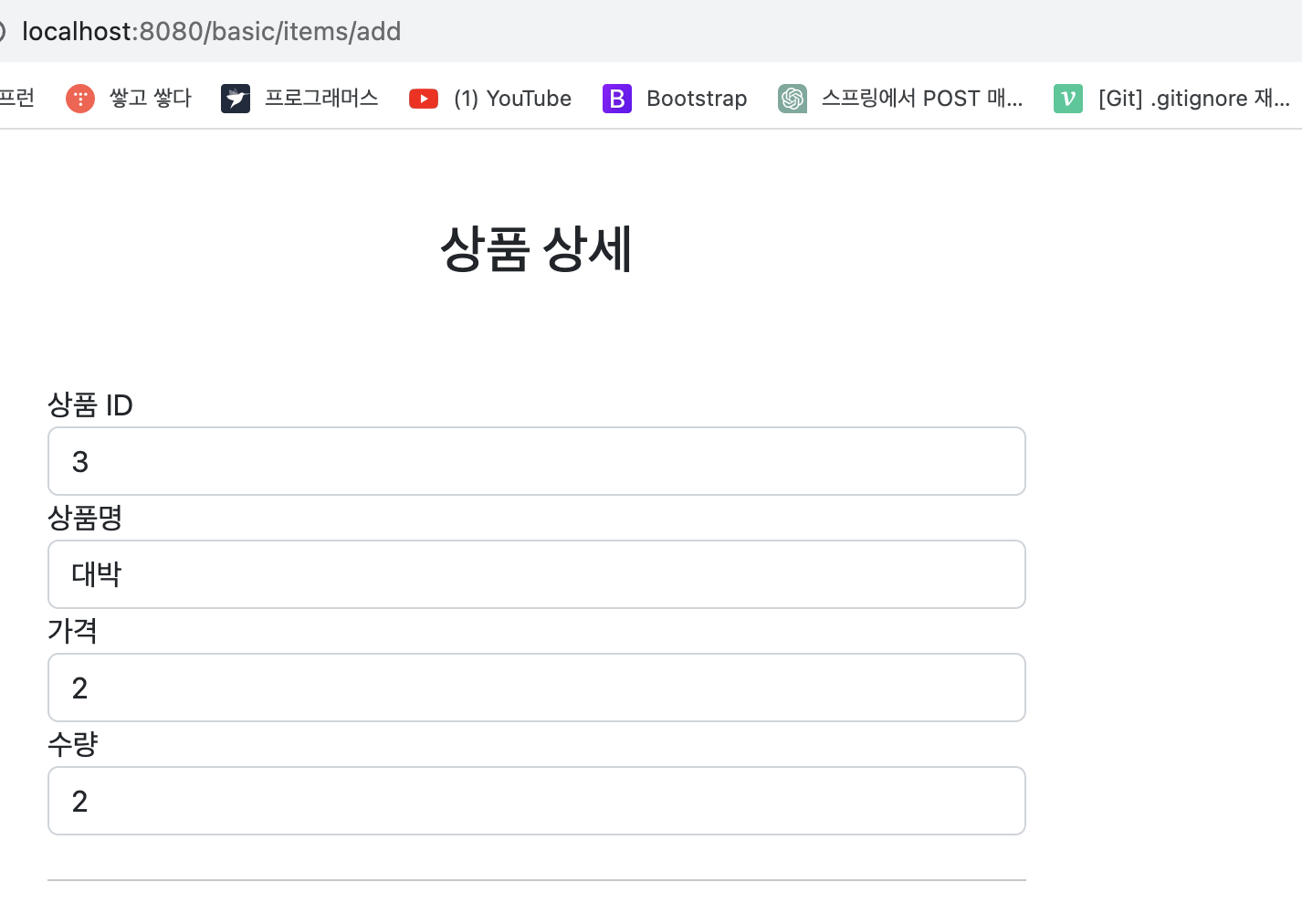 상품 폼을 작성하고 POST 요청을 보냈다.
