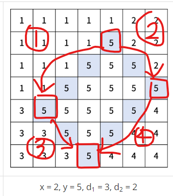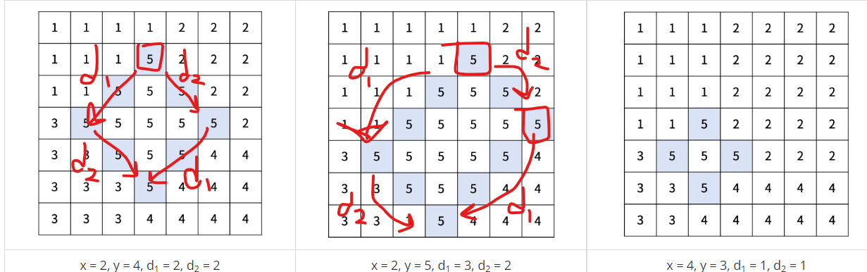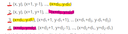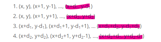 또 여기서 3번 방법으로 이어지는데 (x+d1,y-d1)부터 (x+d1+d2,y-d1+d2)로 그려집니다