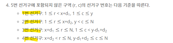 if (i + D1 + D2 > N || j - D1 + D2 > N) // 3로 이동이 불가능 ?