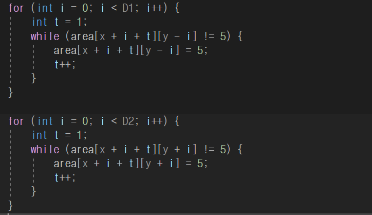 area[x + D2 + i][y + D2 -i] = 5; // 4