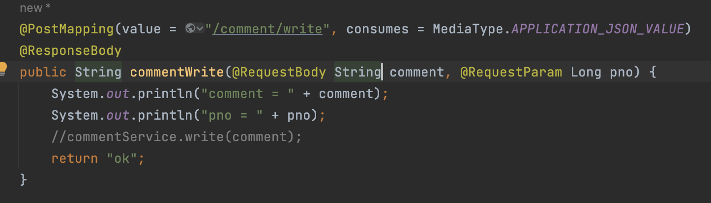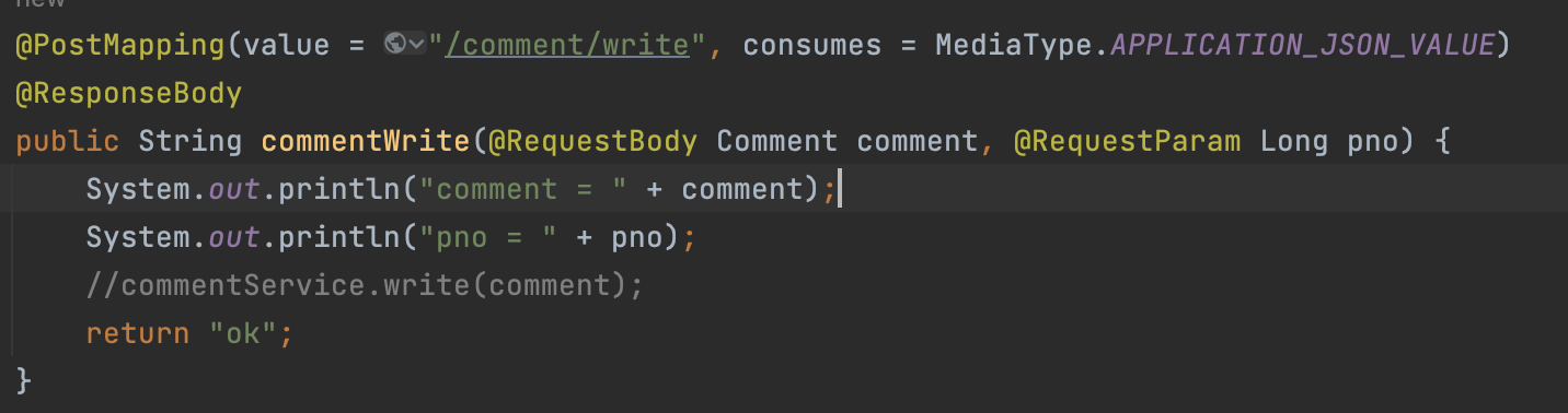 public String commentWrite(@RequestBody Comment comment, @RequestParam Long pno) {