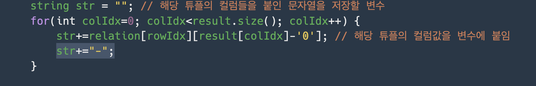 str+=relation[rowIdx][result[colIdx]-'0']; // 해당 튜플의 컬럼값을 변수에 붙임