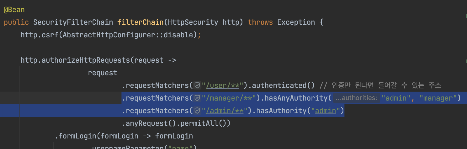 hasAnyRole("ADMIN", "MANAGER") => hasAnyAuthority 또는 hasAuthority로 변경했다.