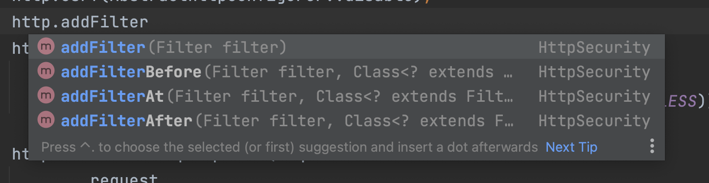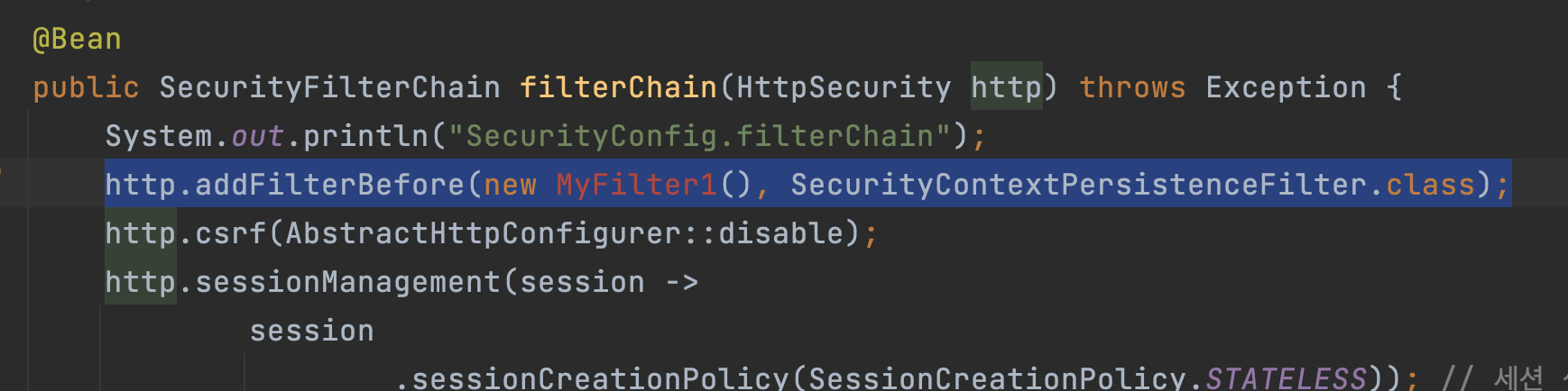 SecurityConfig에 다음 메서드를 사용하여 특정 스프링 시큐리티 필터 Before, After에 끼워 넣을 수도 있다.