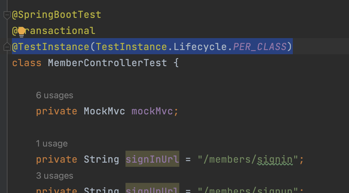 다음과 같이 테스트 클래스의 Life Cycle을 클래스단위로 바꿔주자.