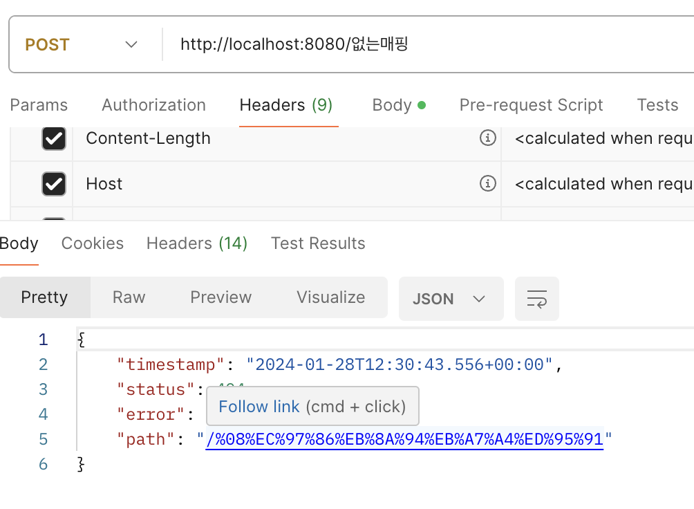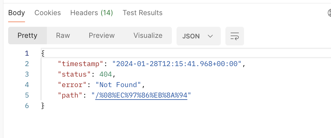 그러면 이제 정상적으로 매핑하지 않은 요청에 대해 404 에러가 뜬다.