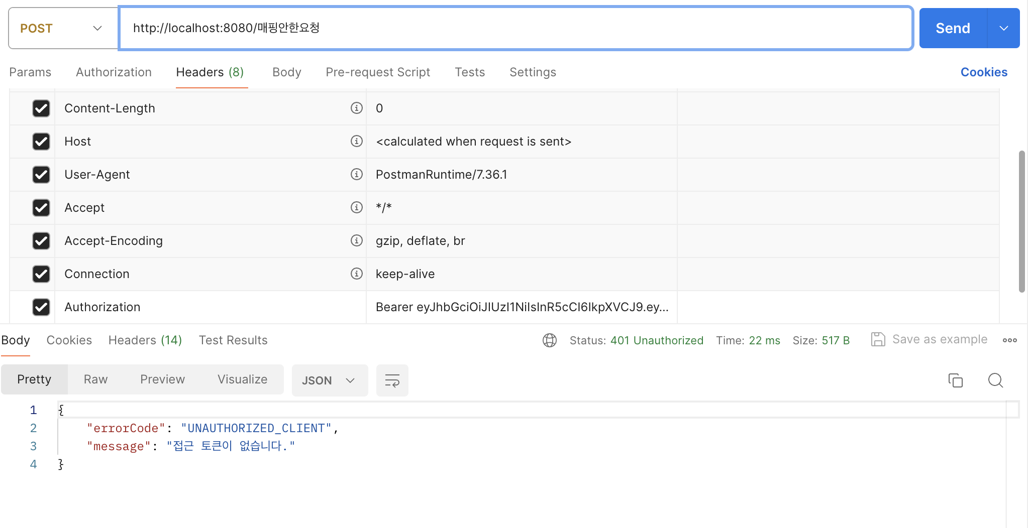 내가 예외 처리한 401 에러가 뜬다..!