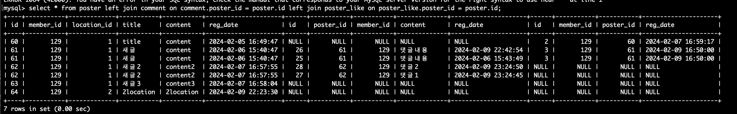 사진을 이해하려면 복잡하기에 간단히 이해하면 댓글마다 해당 게시글의 내용이 앞의 컬럼으로 존재하는 형태이다.