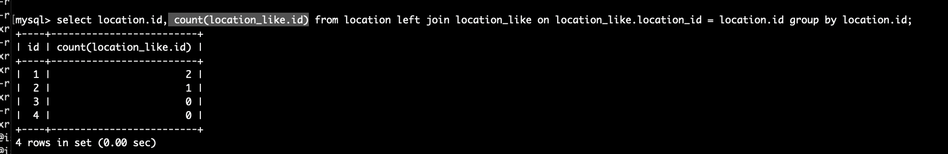 먼저 장소(location)과 장소 좋아요(location_like)의 관계는 1:N이며 left join 했을때 결과는 다음과 같다.