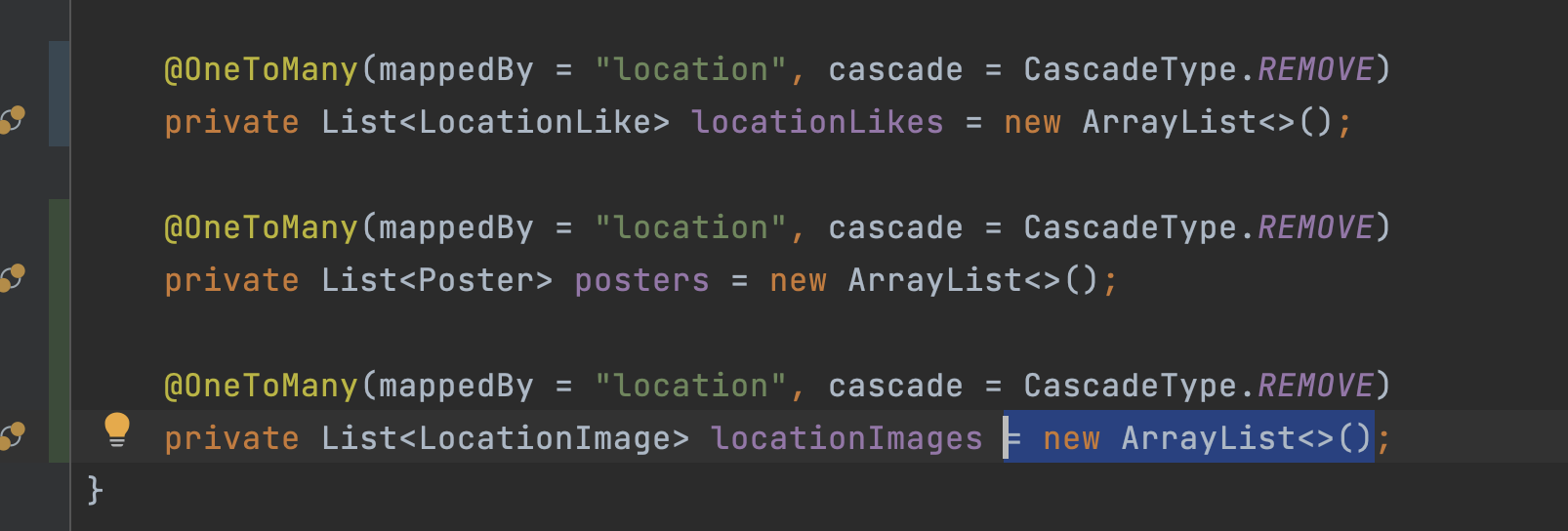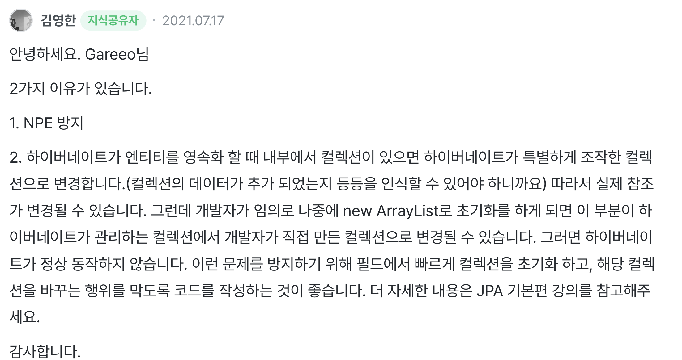 엔티티의 List와 같은 컬렉션 필드는 new로 컬렉션을 초기화해주는 것이 좋다.