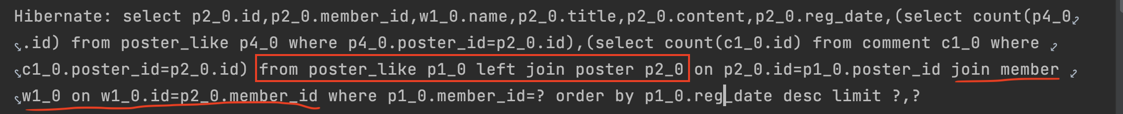 작성한 쿼리는 다음과 같이 내가 좋아요 누른 게시글들의 정보를 뽑아내는 쿼리이다.