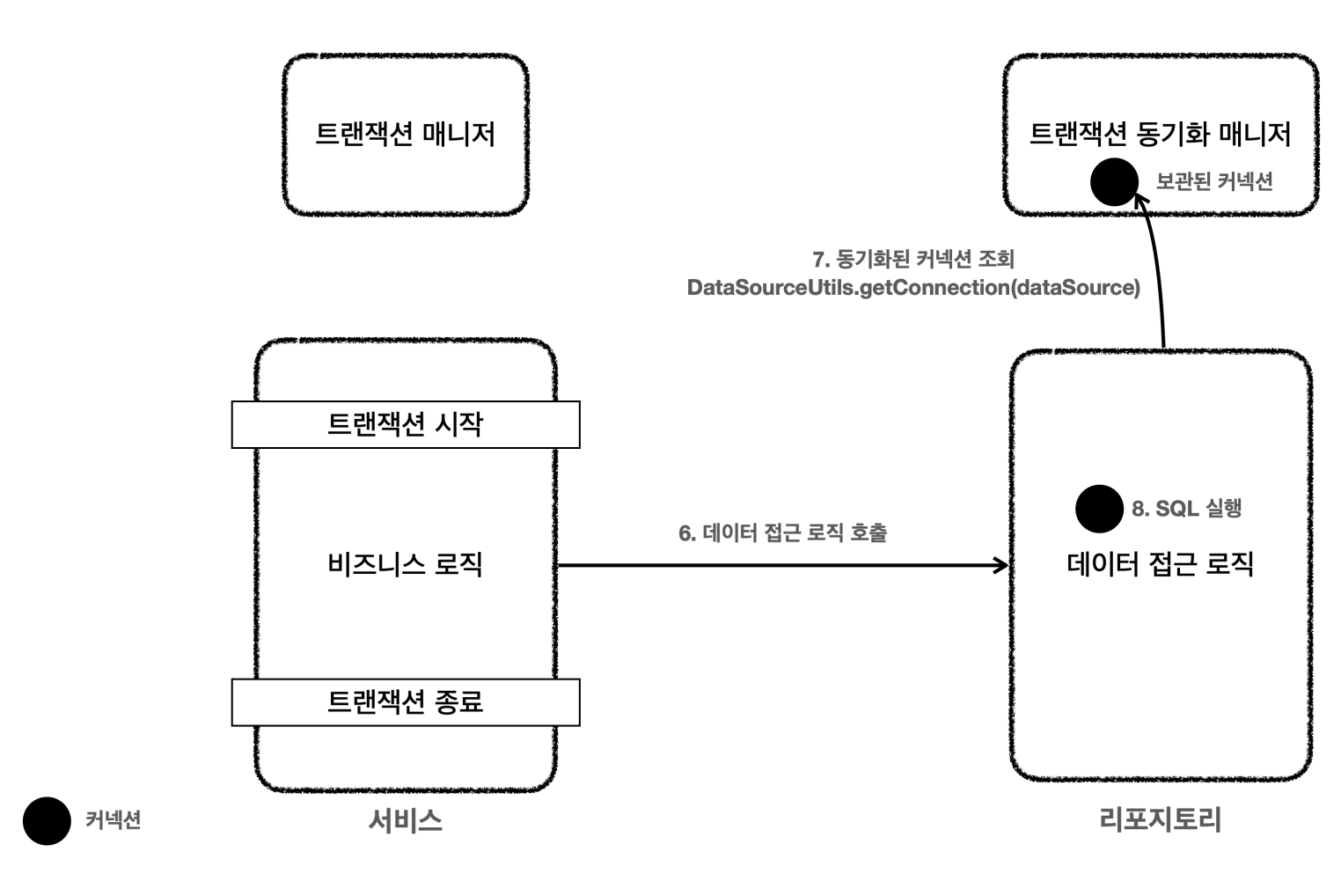 7. 리포지토리 메서드들은 트랜잭션이 시작된 커넥션을 획득 ( 트랜잭션 동기화 매니저에 보관된 동기화된 커넥션 획득 )