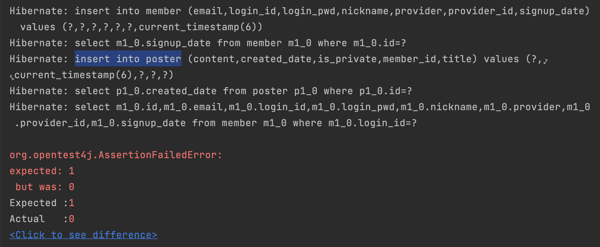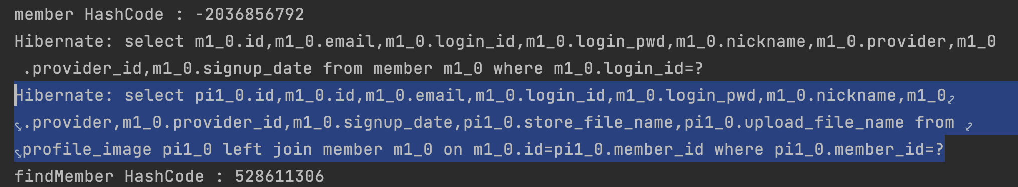 드디어! 회원의 게시글을 조회하는 쿼리가 생성되고 hashCode 또한 달리 출력된다.