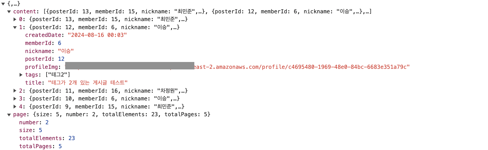 해당 게시글의 태그는 여러개라서 다음과 같이 응답이 나온다.