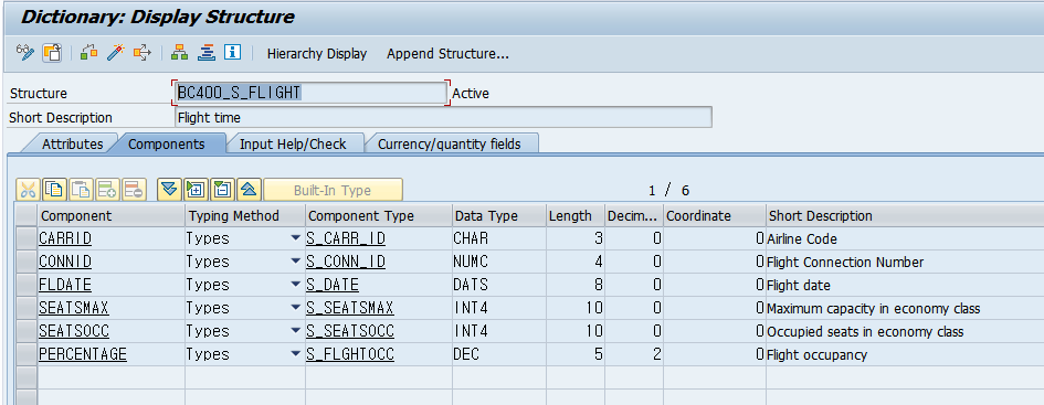 SE11로 Structure 타입인 BC400_S_FLIGHT 값을 조회한 모습이다.