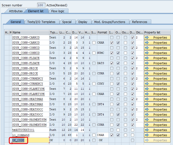 100번 스크린의 Element list에 OK_CODE를 추가해준다.