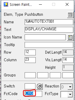 Layout에서 버튼을 생성하고 FctCode 부분에 평션명 "CHG"를 입력한다.