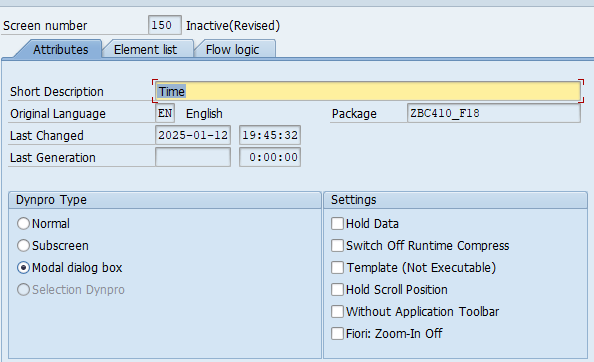 150번 스크린 Dynpro Type을 Modal dialog box로 설정.