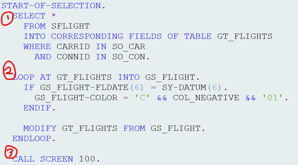 START-OF-SELECTION 부분에서 데이터 취득 및 조작 + 출력이 이뤄진다.