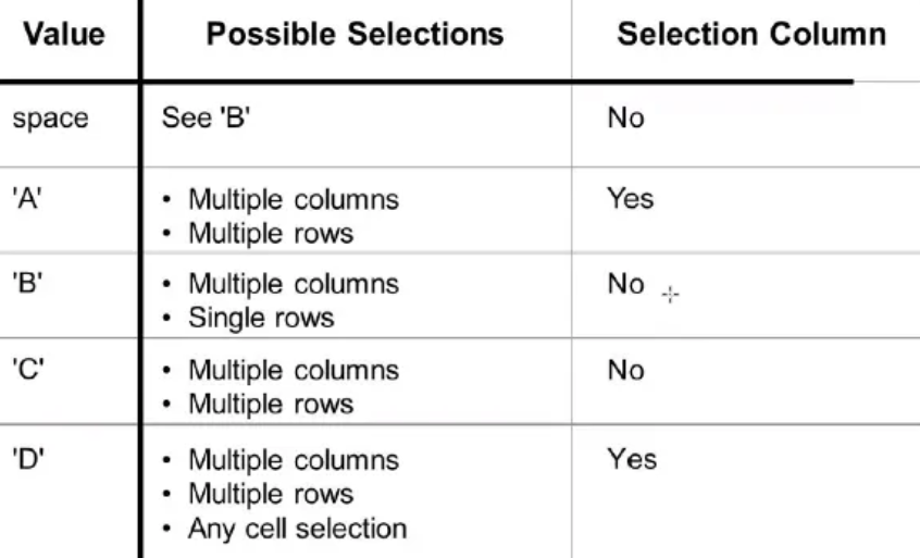 Selection Column의 No, Yes는 컬럼의 맨 위 또는 ROW의 맨 왼쪽에 뜨는 Selection Button의 유무이다.
