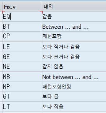 SIGN, OPTION, LOW, HIGH 4개의 컬럼을 갖는다.