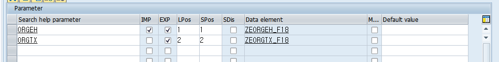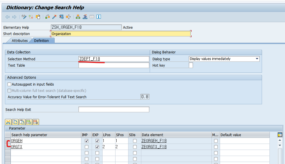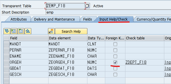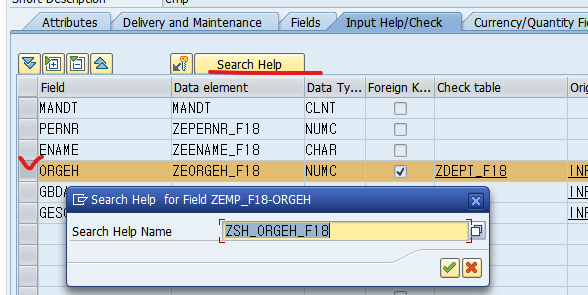 사원 테이블(ZEMP_F18)에 ORGEH는 F4로 Input Help를 띄울 수 있다.