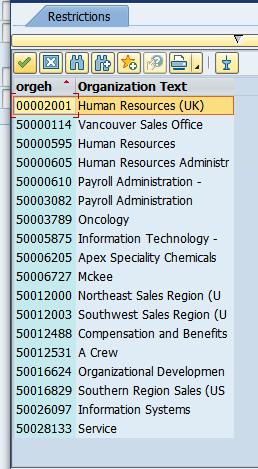 부서코드 ORGEH에 F4(Input Help)를 누르면