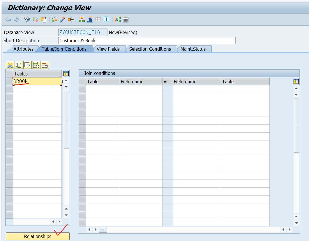 SBOOK을 입력하고 Relationships 버튼을 눌렀다.