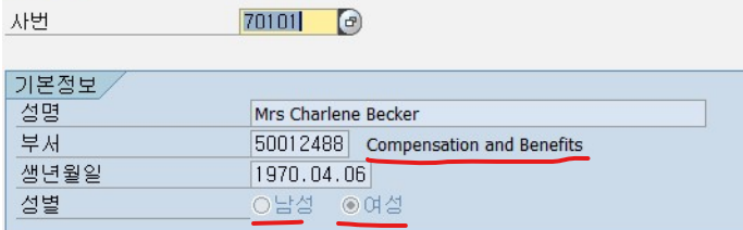조회된 사원의 성별 필드인 GESCH의 값에 따라