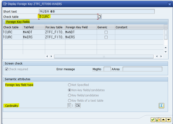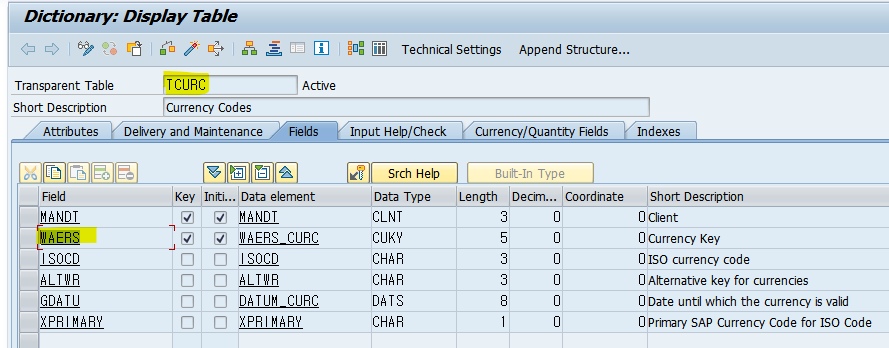 Foreign Key Fields : Check table인 TCURC의 Tabfield WAERS를