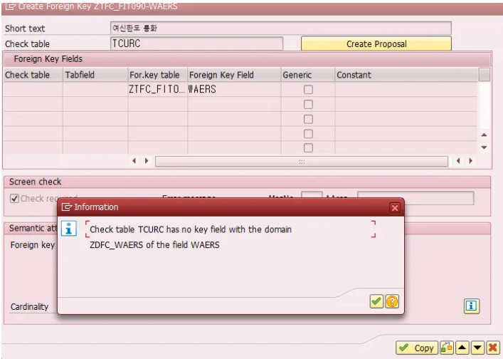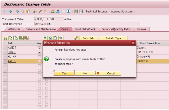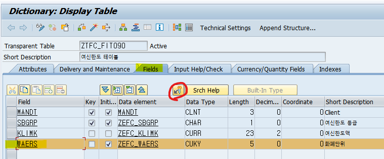 For.key table인 여신한도 테이블 ZTFC_FIT090의 Foreign key Field WAERS와 설정한다.