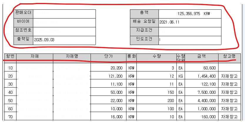 위의 판매오더, 총액과 같은 정보