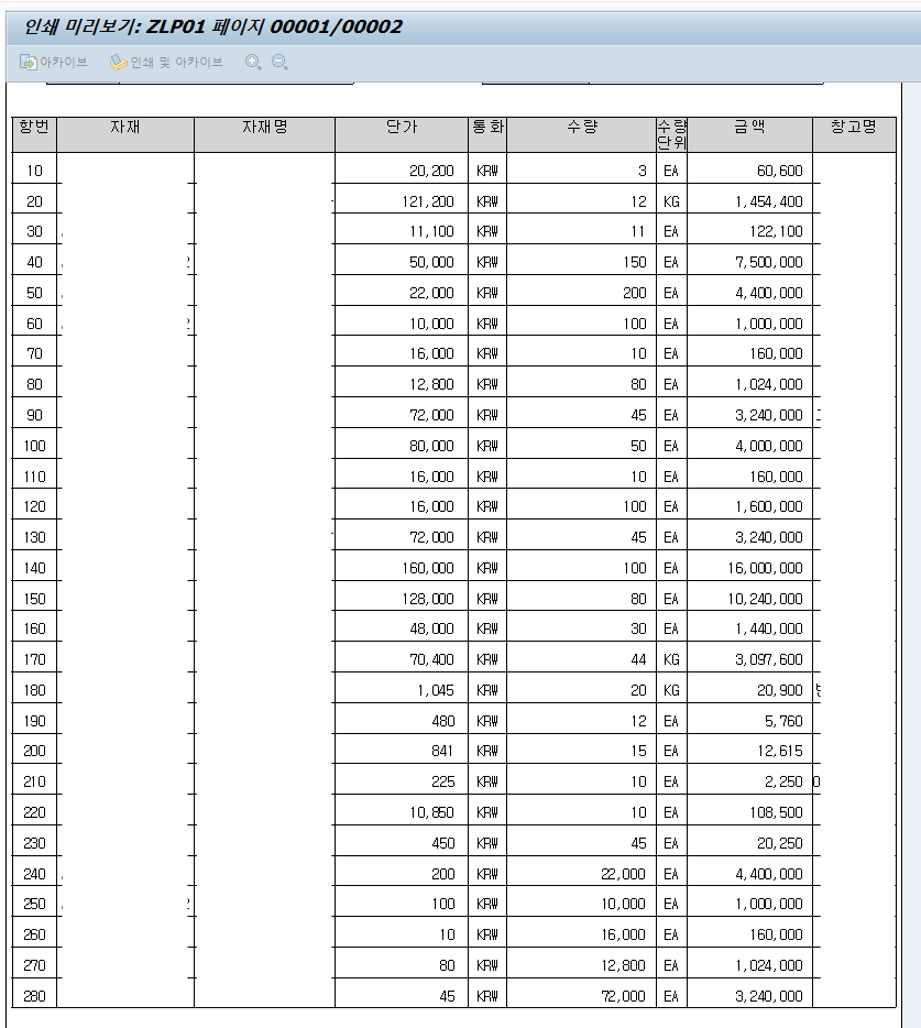 그리고 항번, 자재, 자재명처럼 테이블의 컬럼정보가 다음페이지에서도 표시되도록,