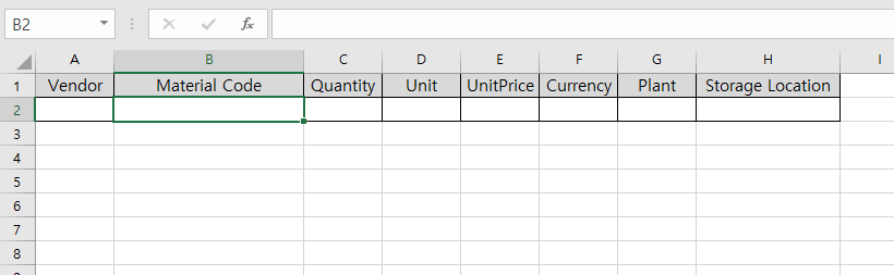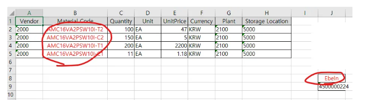 Material Code와 Ebeln은 테두리와 가운데 정렬이 지정되어 있었다.
