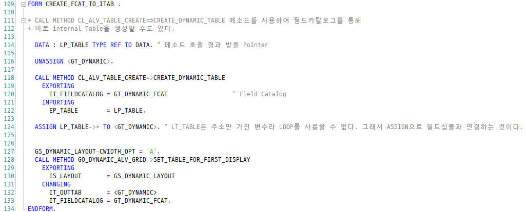 * CALL METHOD CL_ALV_TABLE_CREATE=>CREATE_DYNAMIC_TABLE 메소드를 사용하여 필드카탈로그를 통해