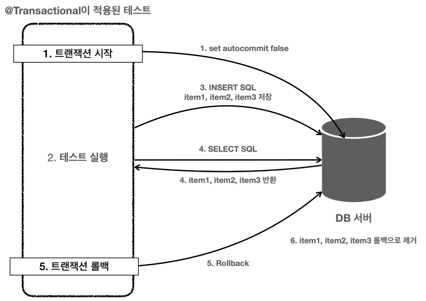 @BeforeEach, @AfterEach를 통해서 트랜잭션의 획득과 롤백을 진행해야한다.